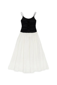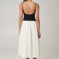 This structured contrast midi with fitted bodice and fluid skirt. cotton top provides breathable support while the skirt adds movement. timeless black and white palette.